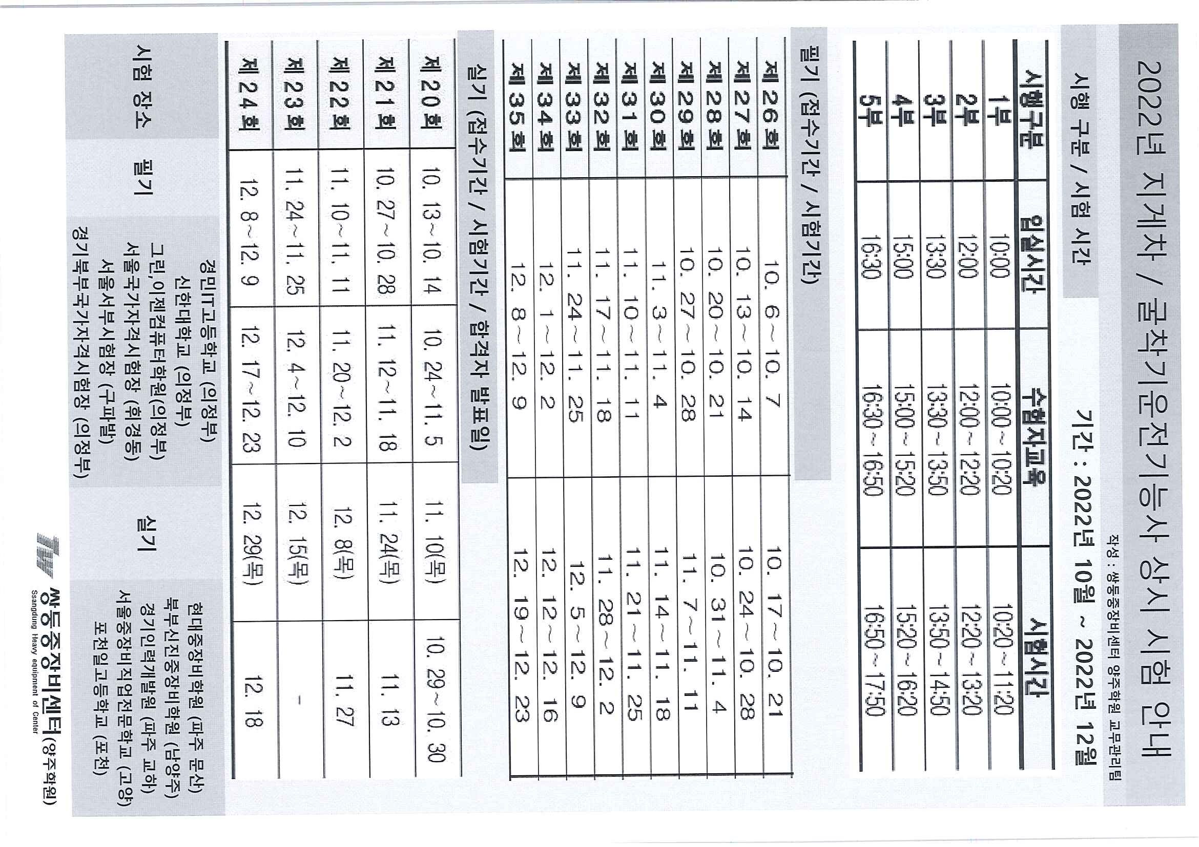 | Á¦¸ñ | [¾È³»] 2022³â 10¿ù ~ 12¿ù Áö°ÔÂ÷, ±¼Âø±â »ó½Ã½ÃÇè ÀÏÁ¤¾È³» |